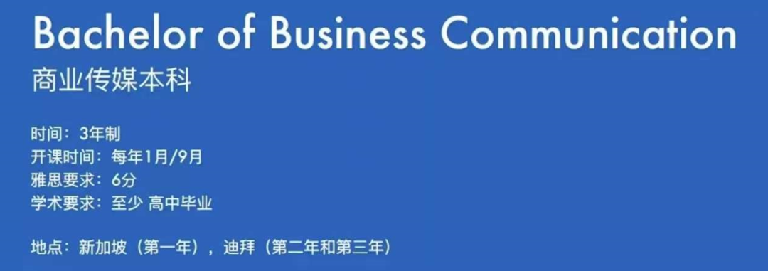 第一年,在新加坡校区学习,专注在商业管理,通用商业知识和当代商业科目,为从事商业活动提供基础。第二年和第三年,在迪拜校区学习传媒和公关方面的专业知识,针对不同的项目和专题进行学习。完成课程后,将理论知识和专业技能应用在工作当中,毕业生主要为商业机构和非营利组织或政府机构工作,就业方向在媒体广告关系,投资者关系,公共关系,市场营销和社交媒体管理等方面工作。