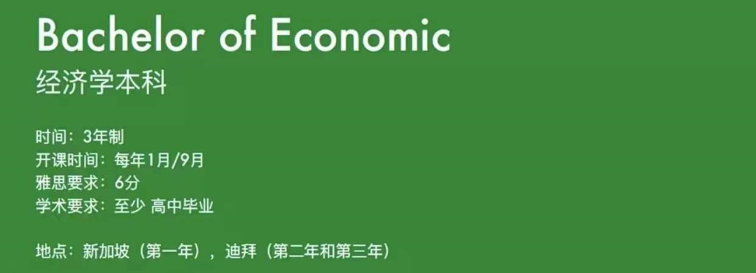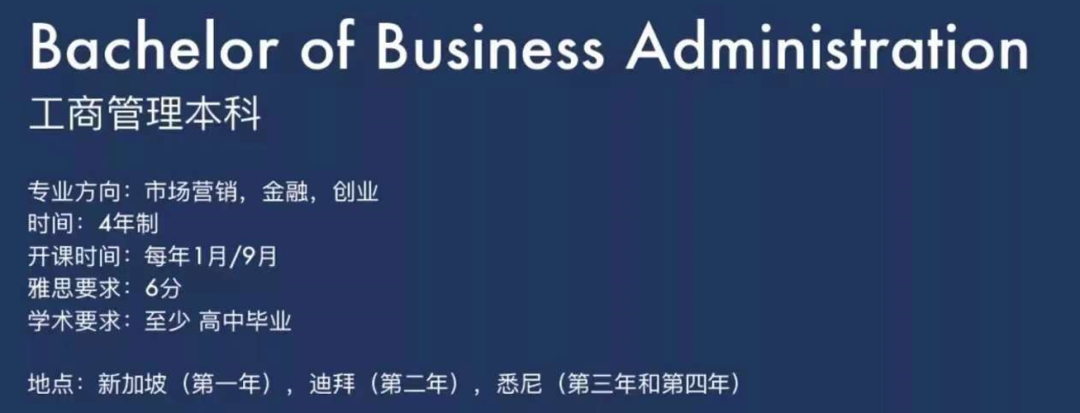 校区 | 大一(新加坡)/大二(迪拜)/大三,大四(悉尼) | 大一(新加坡)/大二,大三(迪拜) | 大一(新加坡)/大二,大三(迪拜) | 第一学期(新加坡)/第二学期(悉尼)/第三学期(迪拜) | 第一学期(新加坡)/第二学期(悉尼)/第三学期(迪拜) |