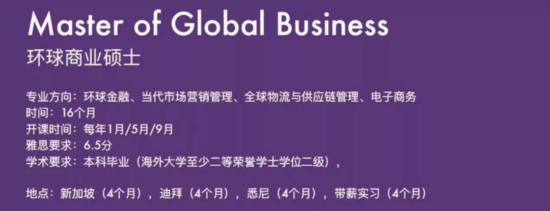 MGB环球商业硕士课程在新加坡校区、迪拜校区和悉尼校区进行,每个校区4个月时间,最后学校会安排4个月的带薪实习(作为课程的一部分),实习可以帮助学生获得宝贵的工作经验,提高学生未来在职业发展的竞争力。