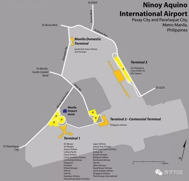 位于马尼拉市南郊,距市中心约12公里。机场有4个航站楼:
